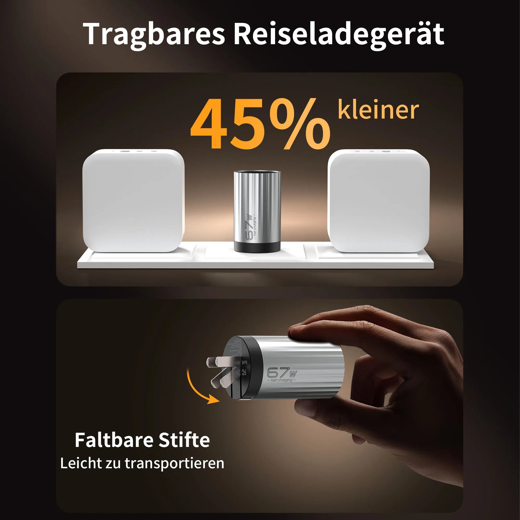 Ultrakompaktes Design, 45 % kleiner als herkömmliche Ladegeräte, leicht zu tragen.