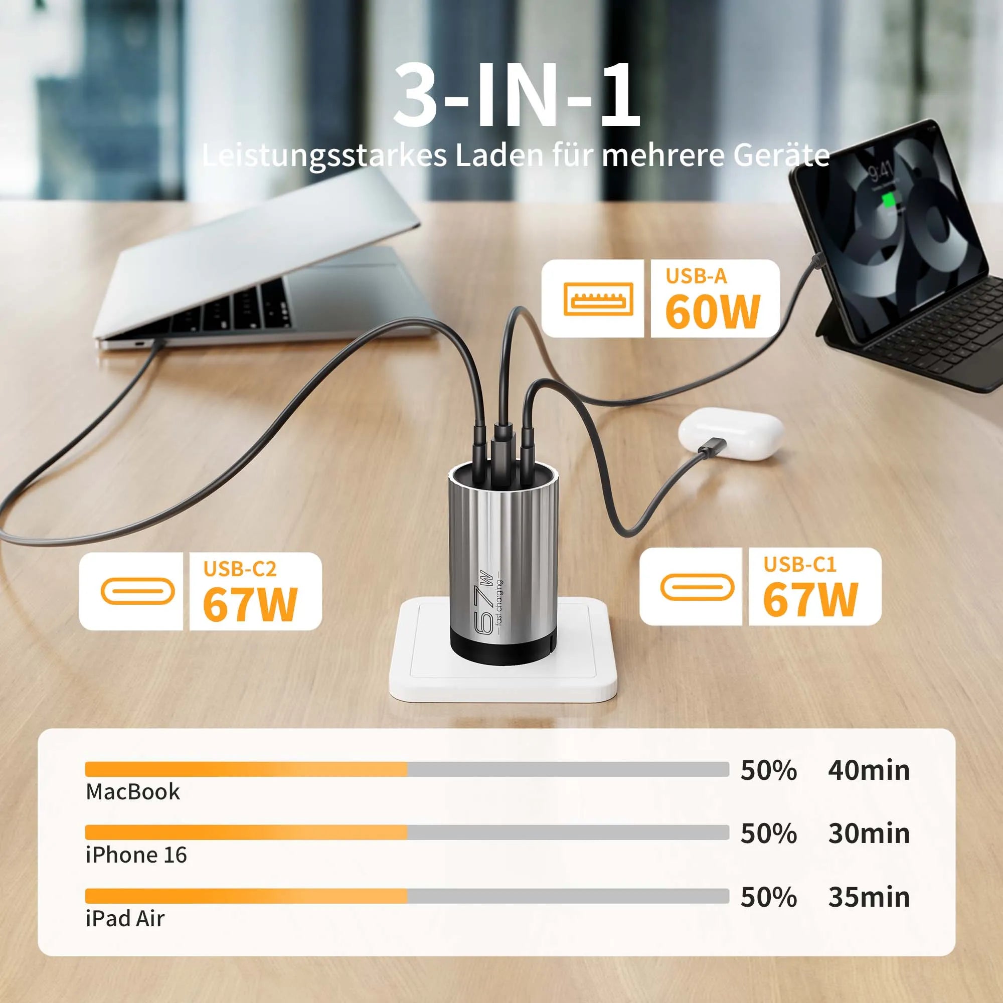Lädt iPhone 16, MacBook und iPad Air in 30–40 Minuten auf 50 % auf.