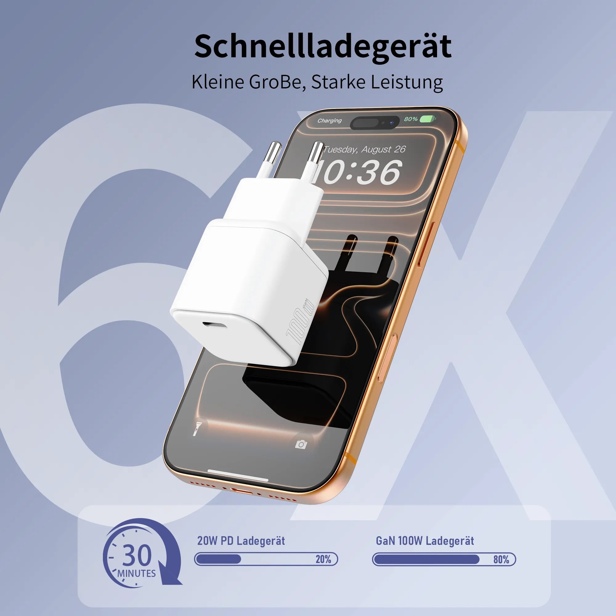 70 % kleiner als herkömmliche 100-W-Ladegeräte – buchstäblich taschengroß