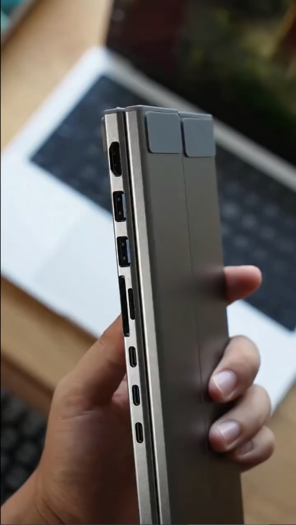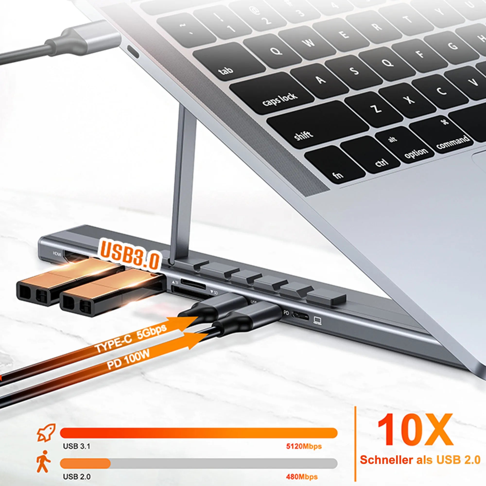 2. 9-in-1-Schnittstellenintegration: 4K HDMI × 1, USB 3.0 × 2 (5 Gbit/s), USB-C PD 3.0 (85 W Schnellladung) × 1, USB-C-Datenanschluss × 1, SD/TF-Kartensteckplatz × 1