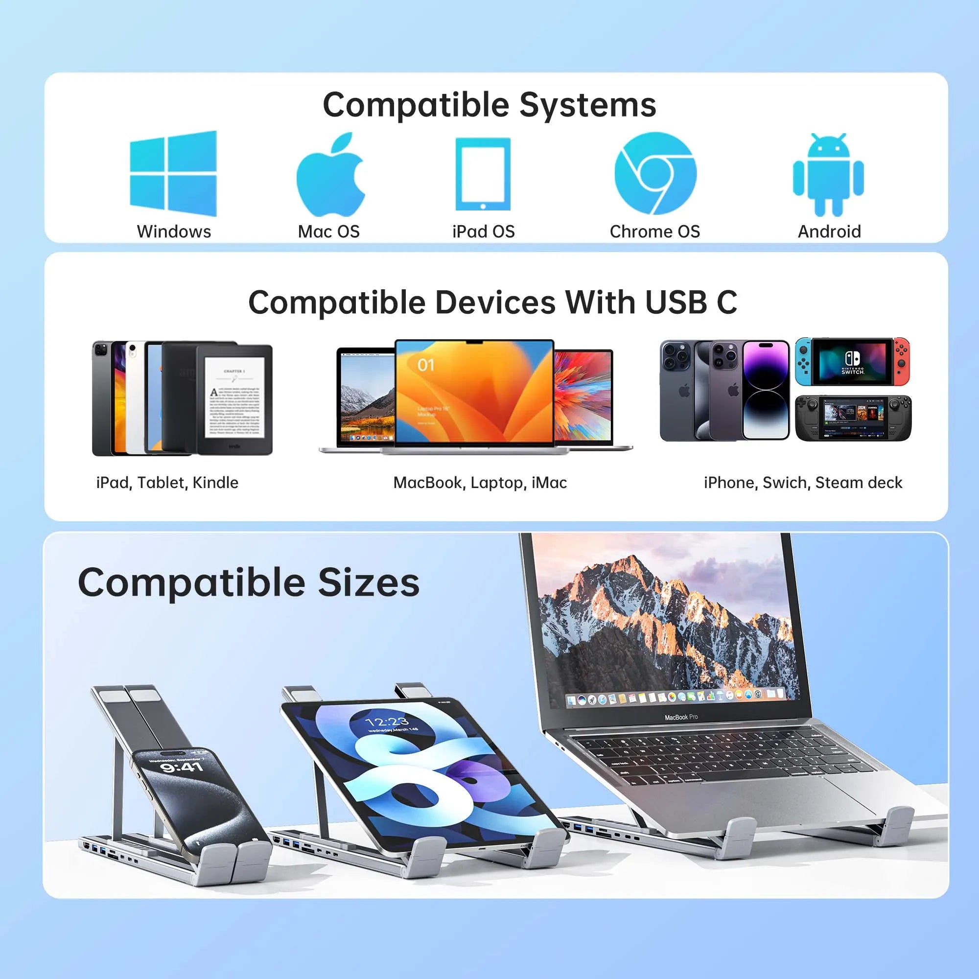 Zu den kompatiblen USB-C-Geräten gehören iPad, Tablets, Kindle, MacBook, Laptops, iMac, iPhone, Switch und Steam Deck.
